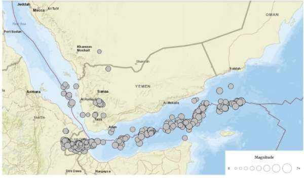ونتيجة لذلك، يحدث توسع وانتشار في قاع البحر الأحمر وخليج عدن، ونتيجة لهذه العملية تتراكم الضغوط على صخور القشرة الأرضية في المنطقة حتى تصل إلى قيم لا تستطيع صخور القشرة مقاومتها، وبالتالي تتحرر على شكل طاقة زلزالية في مناطق الضعف بمقادير مختلفة في كل من اليابسة والماء.
