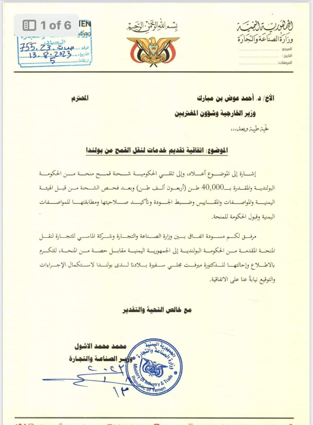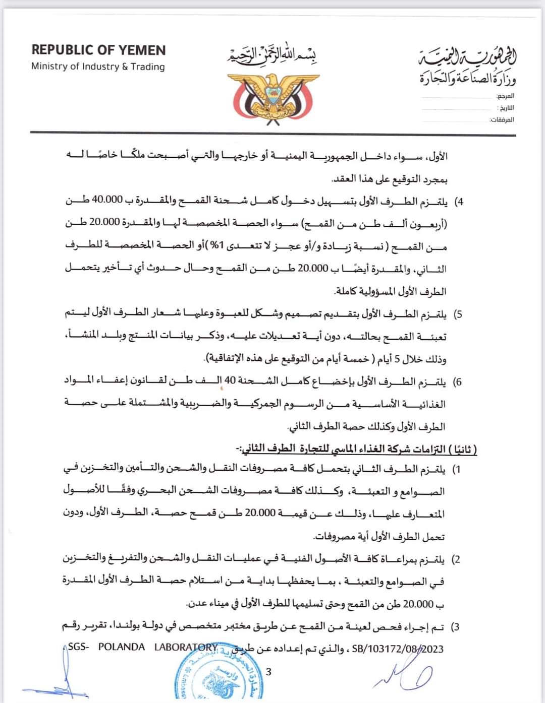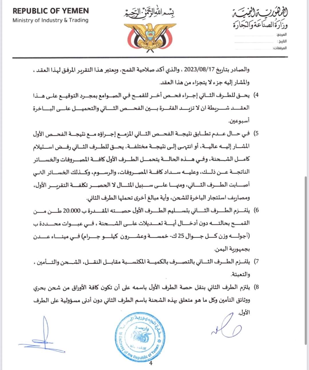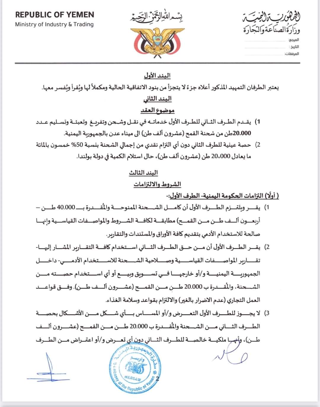 تابعت وزارة التخطيط والتعاون الدولي ما تناولته بعض المواقع الالكترونية وللاسف بعض الصحف والقنوات الفضائية حول موضوع شحنه القمح (البولندي الاوكراني ) وللإفادة والتوضيح تؤكد وزارة التخطيط والتعاون الدولي انه تم إبلاغها والتوجيه لها من دولة الرئيس الوزراء د.معين عبدالملك وذلك في يوم ١١ سبتمبر ٢٠٢٣م، بعد ان رفض دولة الرئيس اعتماد العقد المبرم بين وزارة الصناعة والتجارة وشركة خاصة تسمى (شركة الغداء الماسي) والتي كانت ستأخذ ما نسبته ٥٠٪ من اجمالي كمية الشحنة حيث وقد فوضت وزارة التجارة والصناعة سفيرة اليمن لدى وارسو بتوقيع الاتفاق مع المستفيد وشحن الشحنة من صوامع غلال ميناء GDANSK البولندي وكان اخر يوم مسموح لنقل الشحنة هو ١٥ سبتمبر ٢٠٢٣م كما علمت الوزارة بالأمر حينها من المعنيين حيث وقد ظل الامر في قنوات وزارتي التجارة والصناعة والخارجية عبر سفارتنا ببولندا، ولأن وزارة التخطيط والتعاون الدولي معنية بالمنح والمساعدات وكان المفترض ان تمر هذه القضية وغيرها عبرها وبحيث ستجد القنوات المناسبة كما يصل يومياً الغذاء لملايين اليمنيين في كل المحافظات حيث قامت بمخاطبة برنامج الغذاء العالمي والذي اعتذر ووضح باعتذاره عن عدم قدرته على تحمل نفقات نقل وتغليف وتوزيع الشحنة الى المستفيدين بكل محافظات اليمن وهو مبلغ كبير لم يستطيع البرنامح توفيره نظراً لانخفاض التمويلات بشكل عام.