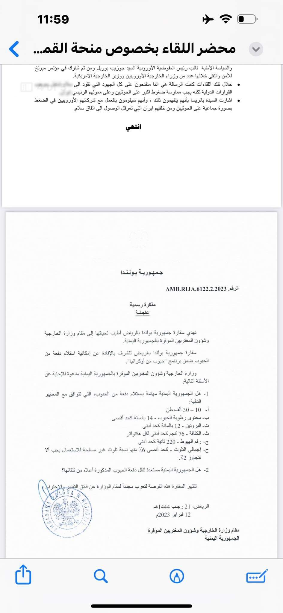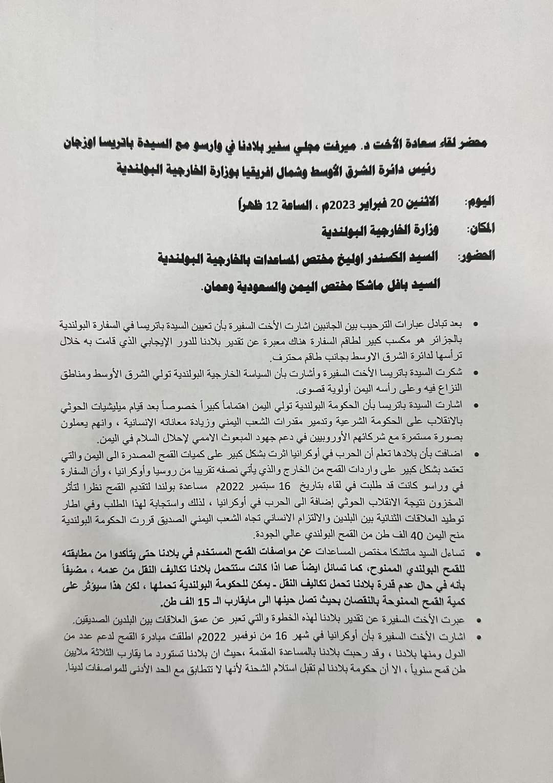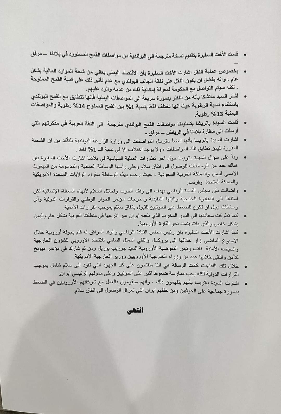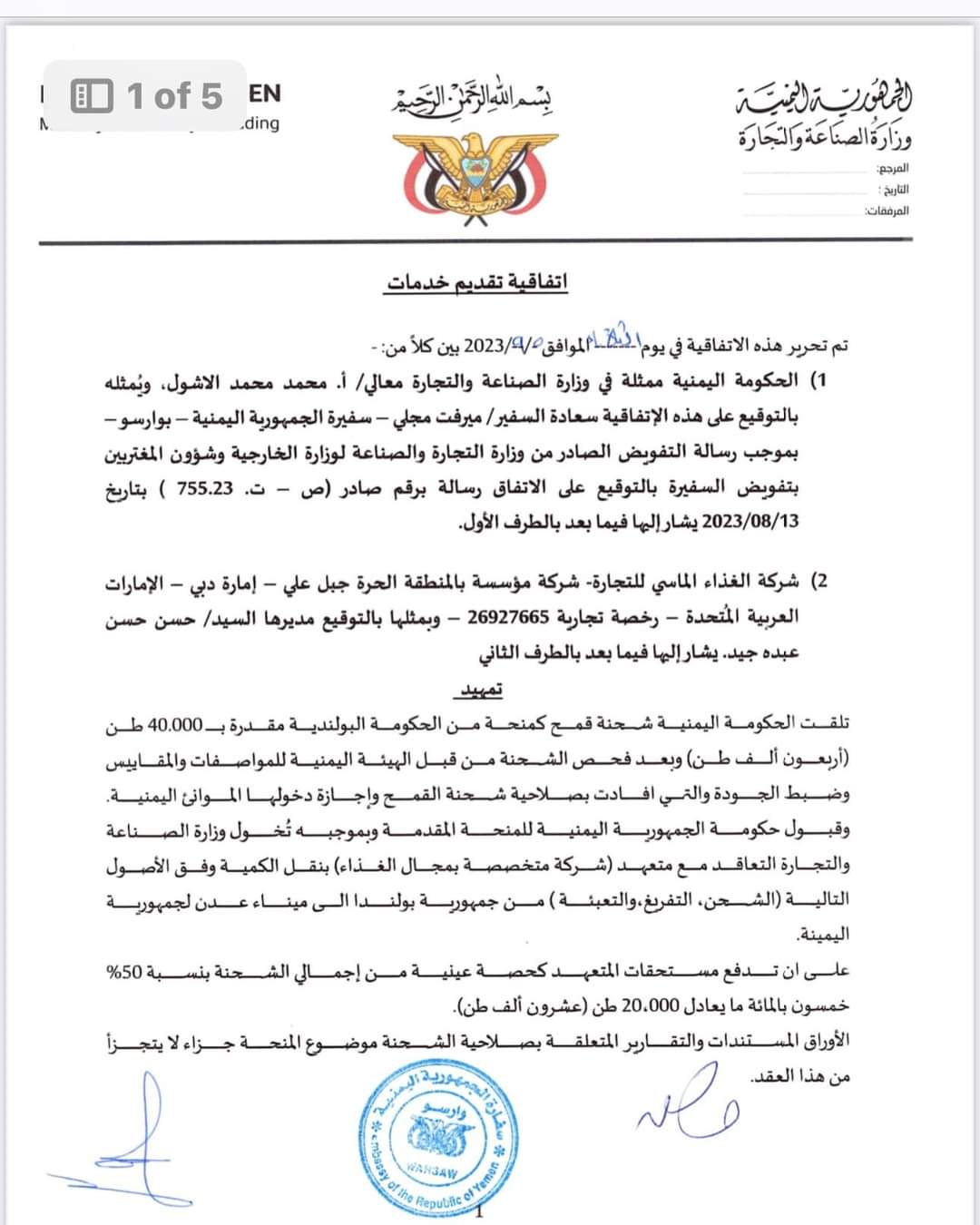 تابعت وزارة التخطيط والتعاون الدولي ما تناولته بعض المواقع الالكترونية وللاسف بعض الصحف والقنوات الفضائية حول موضوع شحنه القمح (البولندي الاوكراني ) وللإفادة والتوضيح تؤكد وزارة التخطيط والتعاون الدولي انه تم إبلاغها والتوجيه لها من دولة الرئيس الوزراء د.معين عبدالملك وذلك في يوم ١١ سبتمبر ٢٠٢٣م، بعد ان رفض دولة الرئيس اعتماد العقد المبرم بين وزارة الصناعة والتجارة وشركة خاصة تسمى (شركة الغداء الماسي) والتي كانت ستأخذ ما نسبته ٥٠٪ من اجمالي كمية الشحنة حيث وقد فوضت وزارة التجارة والصناعة سفيرة اليمن لدى وارسو بتوقيع الاتفاق مع المستفيد وشحن الشحنة من صوامع غلال ميناء GDANSK البولندي وكان اخر يوم مسموح لنقل الشحنة هو ١٥ سبتمبر ٢٠٢٣م كما علمت الوزارة بالأمر حينها من المعنيين حيث وقد ظل الامر في قنوات وزارتي التجارة والصناعة والخارجية عبر سفارتنا ببولندا، ولأن وزارة التخطيط والتعاون الدولي معنية بالمنح والمساعدات وكان المفترض ان تمر هذه القضية وغيرها عبرها وبحيث ستجد القنوات المناسبة كما يصل يومياً الغذاء لملايين اليمنيين في كل المحافظات حيث قامت بمخاطبة برنامج الغذاء العالمي والذي اعتذر ووضح باعتذاره عن عدم قدرته على تحمل نفقات نقل وتغليف وتوزيع الشحنة الى المستفيدين بكل محافظات اليمن وهو مبلغ كبير لم يستطيع البرنامح توفيره نظراً لانخفاض التمويلات بشكل عام.