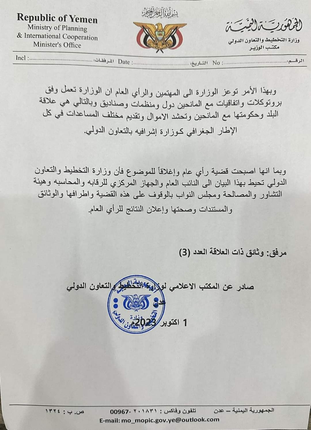 صادر عن المكتب الاعلامي لوزارة التخطيط والتعاون الدولي