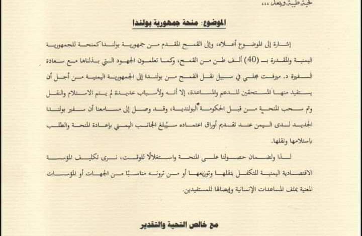 آخر مستجدات فضيحة شحنة القمح البولندي المقدمة للشعب اليمني الجائع.