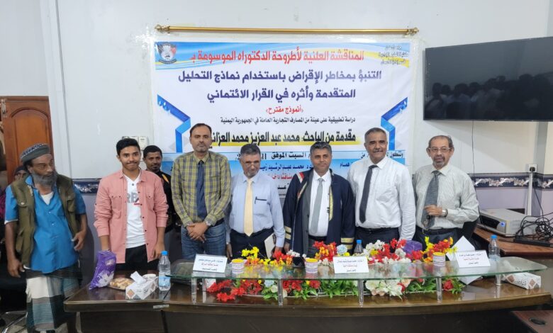 منحت كلية العلوم الإدارية جامعة عدن صباح اليوم درجة الدكتوراة للباحث/محمد عبد العزيز محمد العزاني عن أطروحتة الموسومة بعنوان (التنبؤ بمخاطر الأقراض بإستخدام نماذج التحليل المتقدمة وأثره في القرار الائتماني) التي ركزت على عينة من المصارف التجارية العاملة في الجمهورية اليمنية.