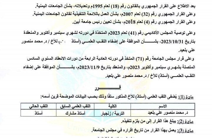 بعث الأستاذ الدكتور/ جمال محمد ناصر الحسني عميد كلية الآداب بجامعة عدن، برقية تهنئة إلى الدكتور/ محمد منصور علي بلعيد أستاذ التاريخ المشارك بكلية التربية زنجبار جامعة أبين بمناسبة صدور قرار رئيس الجامعة رقم (143) لعام 2023م بشأن إضفاء اللقب العلمي (أستاذ).