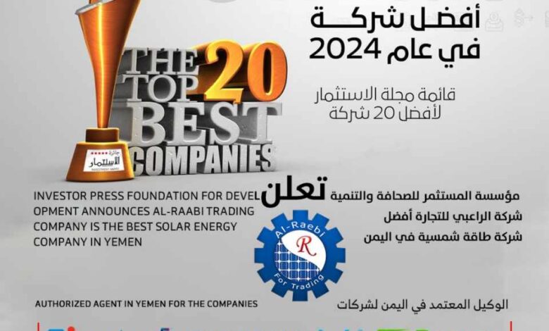 شركة الراعبي تحصل على المركز الأول كأفضل شركة طاقة شمسية في اليمن