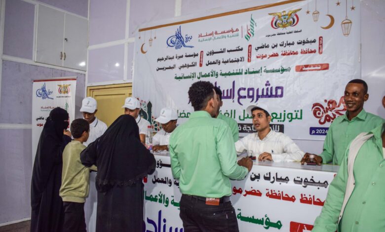 بدوره أفاد رئيس مؤسسة إسناد للتنمية والأعمال الإنسانية، الأستاذ سالم بن دحيم، بأن المشروع يستفيد منه 1500 أسرة بمدينة المكلا، عبر تقديم لهم كوبونات، بقيمة 65 ألف ريال، لشراء مايحتاجوه حسب اختيارهم ورغبتهم بعد التنسيق مع إدارة مول المكلا، متمثلًا في الشيخ عبيد بن كردوس التميمي، وتذليل كافة الاحتياجات لسير العمل، وتجهيز عدد 3500 سلة أخرى لضواحي المكلا، وستشمل حي غرير غرب المكلا والعشوائي وغيظة البهيش وحجر وميفع وشحير.