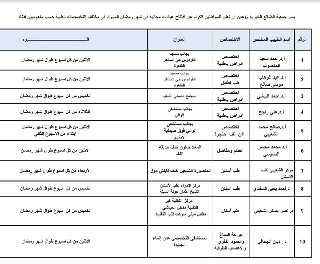 أعلنت جمعية الضالع الخيرية الاجتماعية اليوم الاثنين تاريخ 11مارس 2024م عن افتتاح عيادات مجانية للمواطنين الكرام خلال أيام شهر رمضان المبارك في مختلف التخصصات الطبية بحسب ماهو موضح بالجداول التالية: