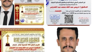 عدن اوبزيرفر/خاصحظيّ الباحث الدكتور إدريس عبدالله محمد عبدالقدوس، مدير بنك الإنشاء والتعمير مأرب، بشهادتي تكريم من الزمالة الدولية للإبداع والعلوم…