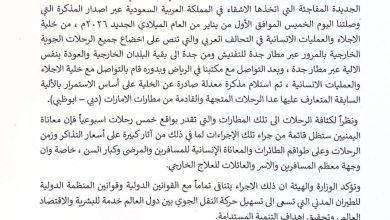 بيان صادر عن وزارة النقل بشأن إخضاع جميع الرحلات الجوية الخارجية بالمرور عبر مطار جدة للتفتيش