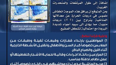 الأرصاد تؤكد تأثر مناطق واسعة من بلادنا بموجة بَرْد مع احتمالية تشكّل الصقيع